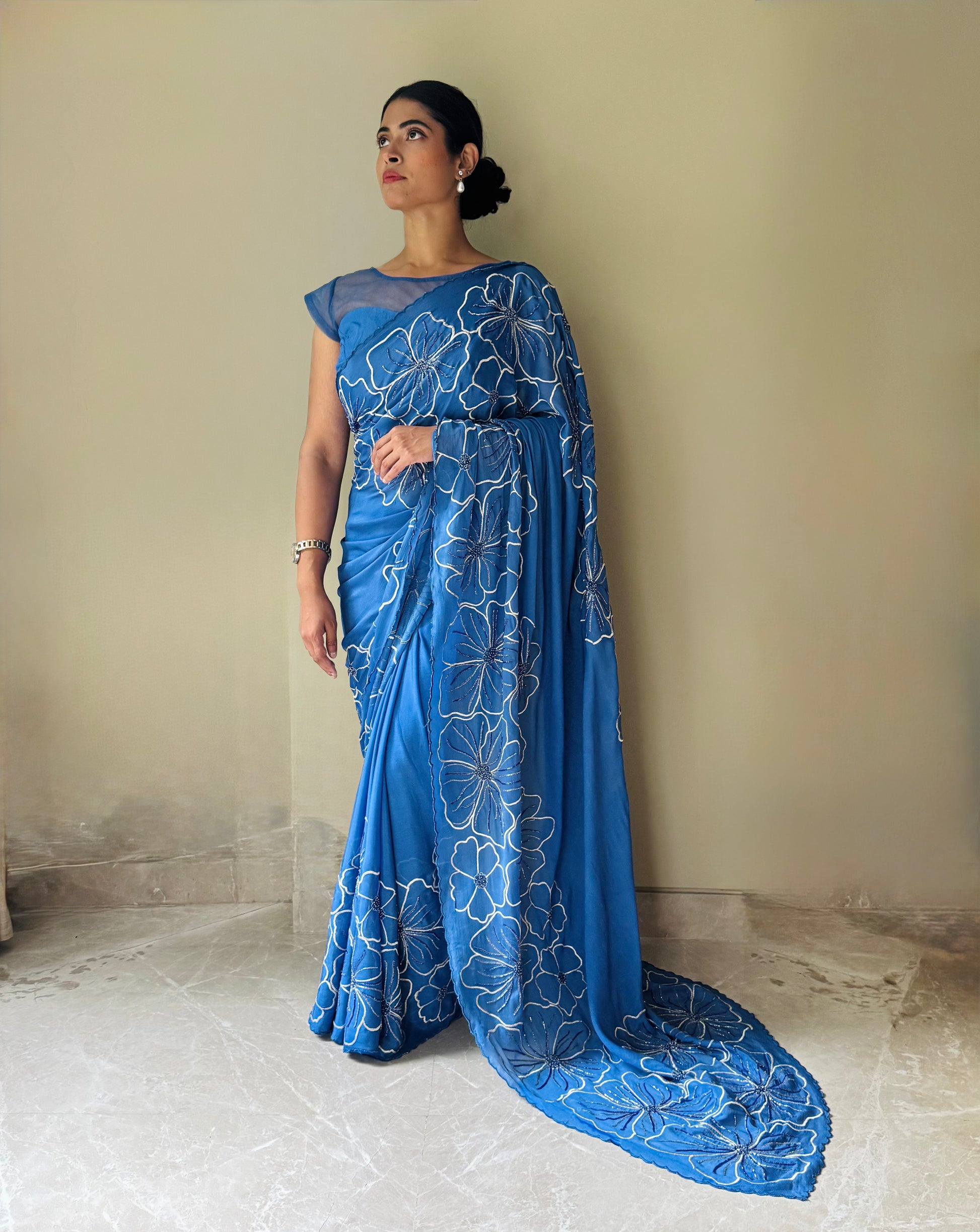 Description: A light blue chiffon saree adorned with soft floral embroidery — airy, elegant, and effortlessly feminine. From our Rangtaari – Chiffon Elegance Collection, this saree is a perfect expression of softness and sophistication. Crafted in lightweight chiffon, it flows beautifully, giving you a flattering, fluid silhouette that moves gracefully with every step.