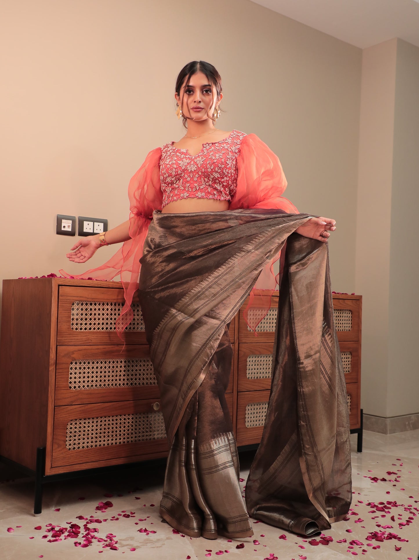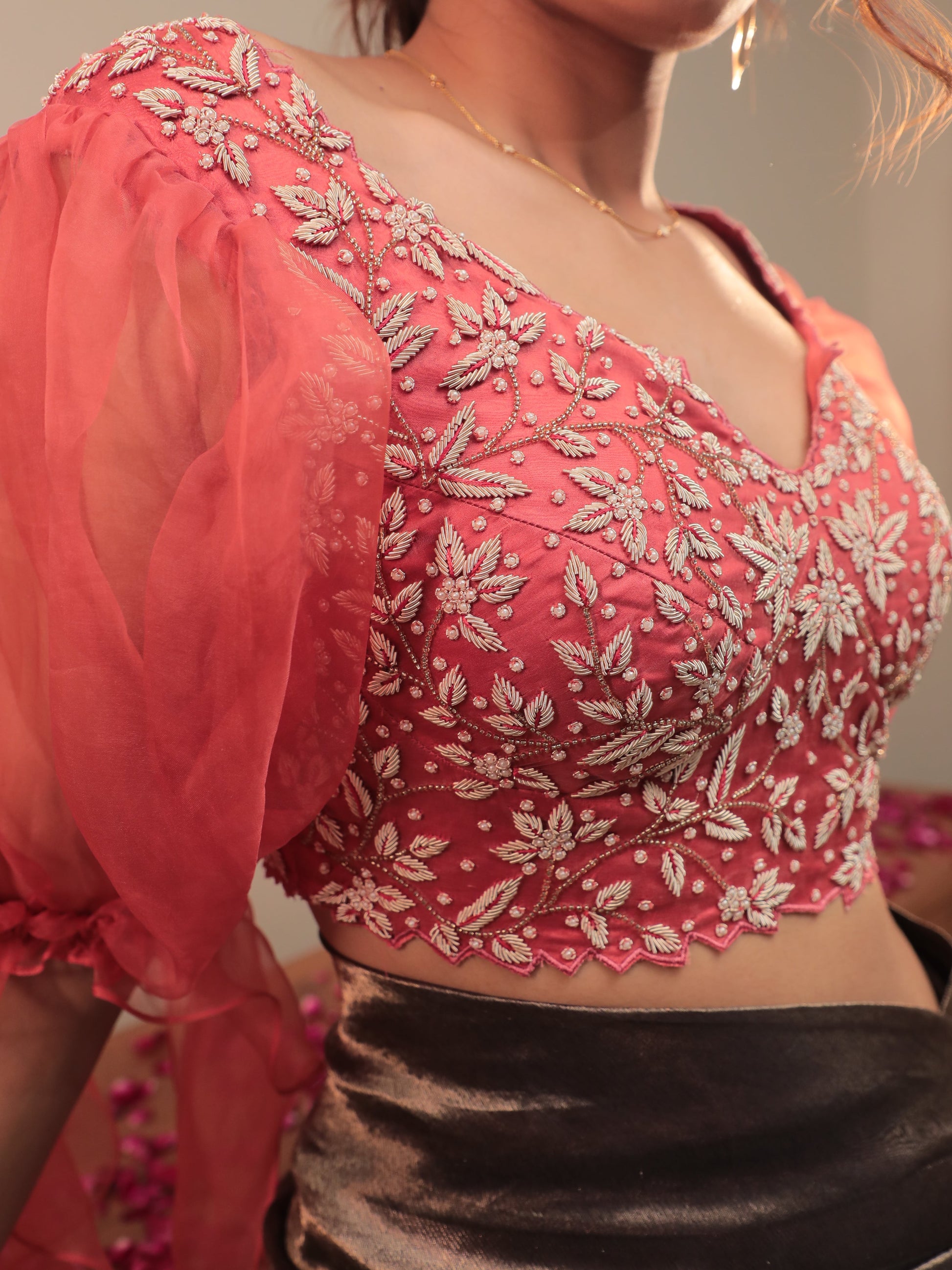 Description:Crafted from luxurious organza, this halter-neck blouse in a rich dark lavender shade is adorned with delicate sequin and cutdana work. Perfect for pairing with flowy sarees or skirts, it adds a touch of modern glamour.