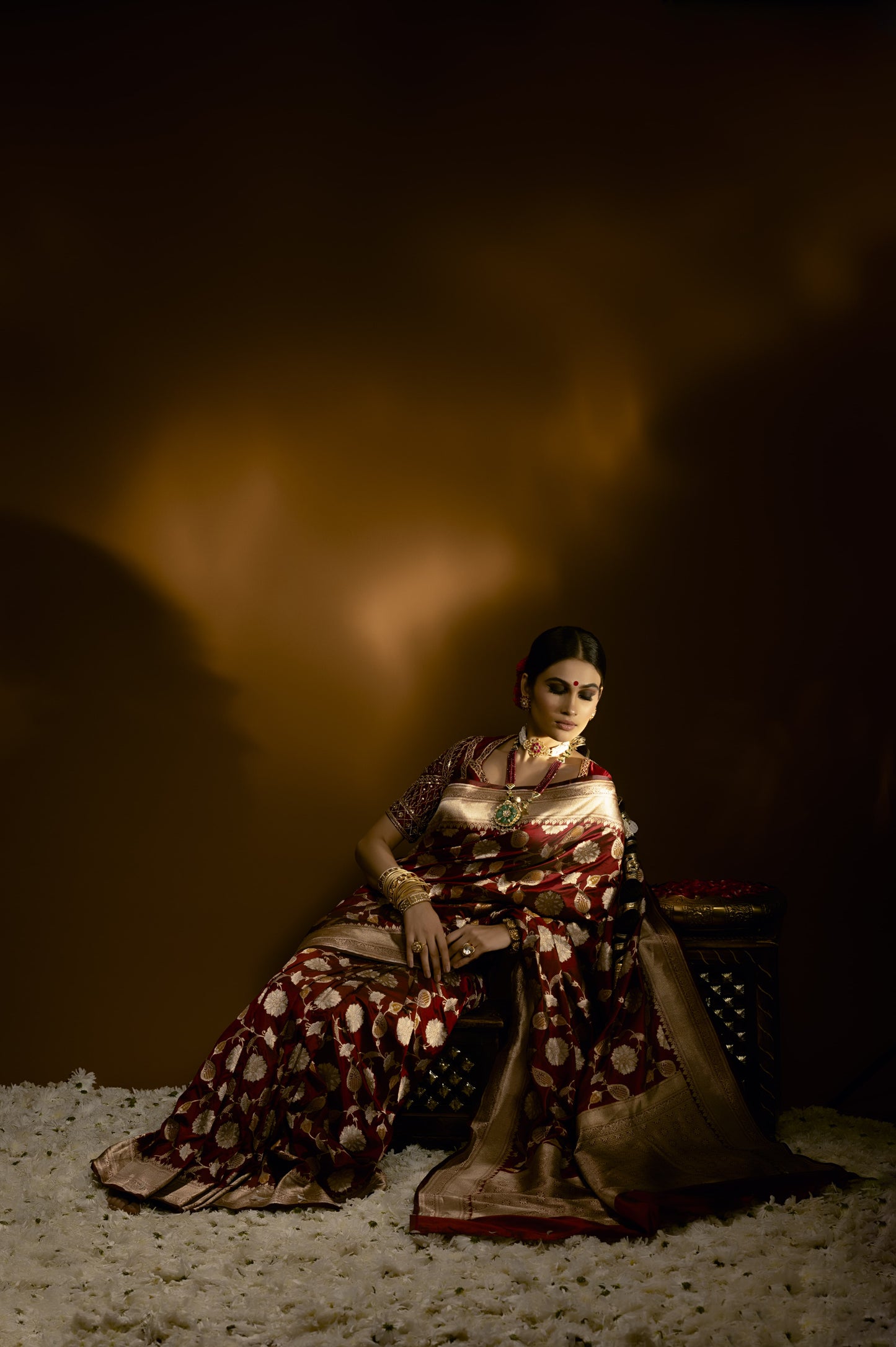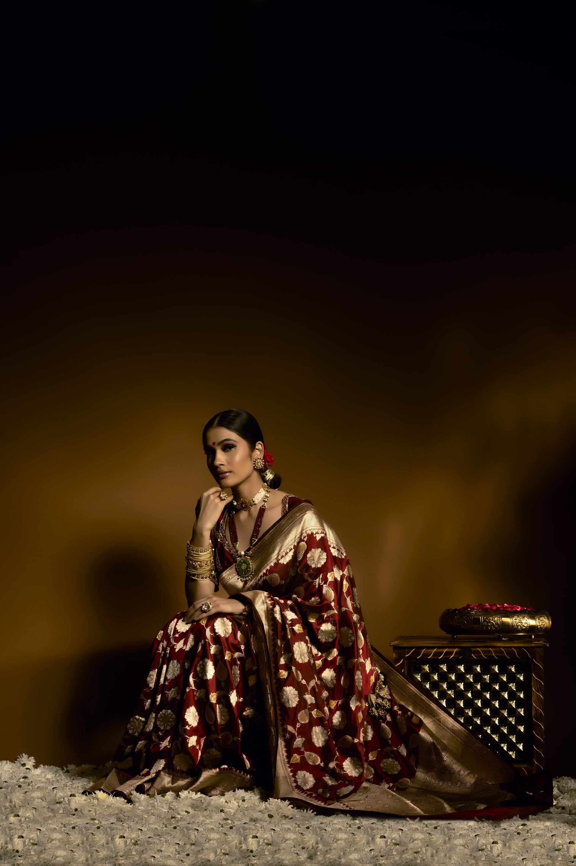 Clothe yourself into PRIYAL BHARDWAJ legacy, Banarasi Silk Saree. This dazzling assemblage of heritage named AMRUTA is a signatory look for PB’s exquisite design spread across the fabric of six yards, perfect for every occasion, hand-weaved in the lanes of Banaras.