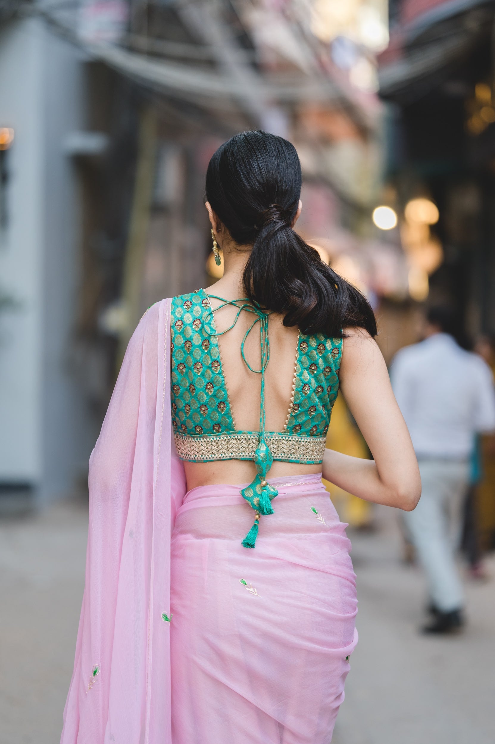 The green with rasham tread and sequnce on it work on it.It has been weaved out with silver zari on brocade fabric.The blouse has boota depicting a beautiful and attractive bird in the shade green with gota patti lace on it for the border