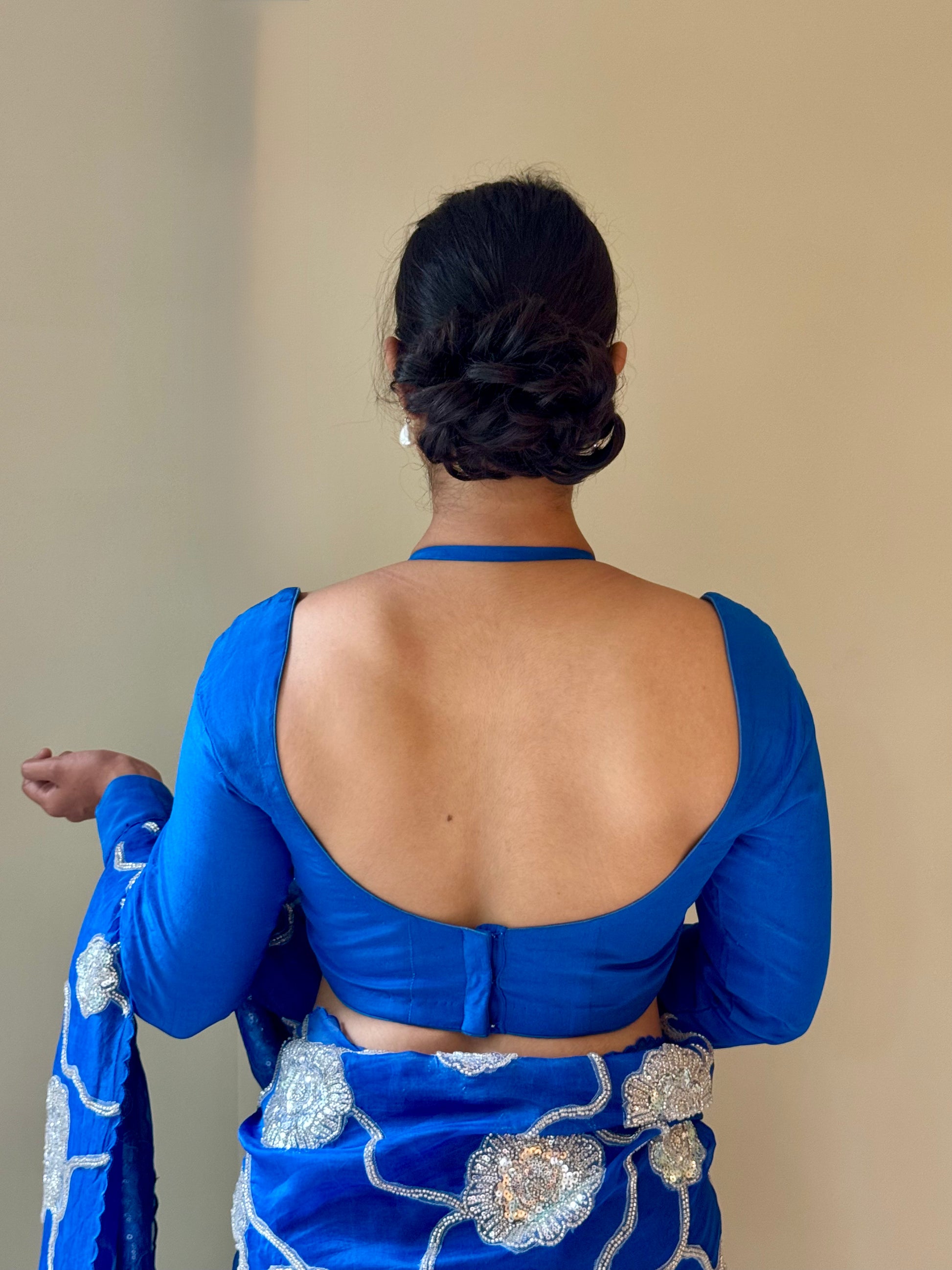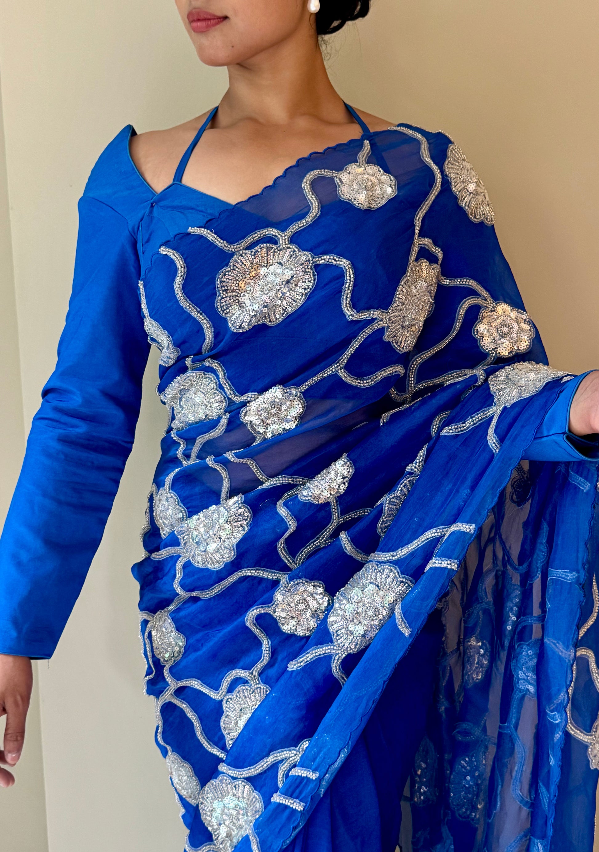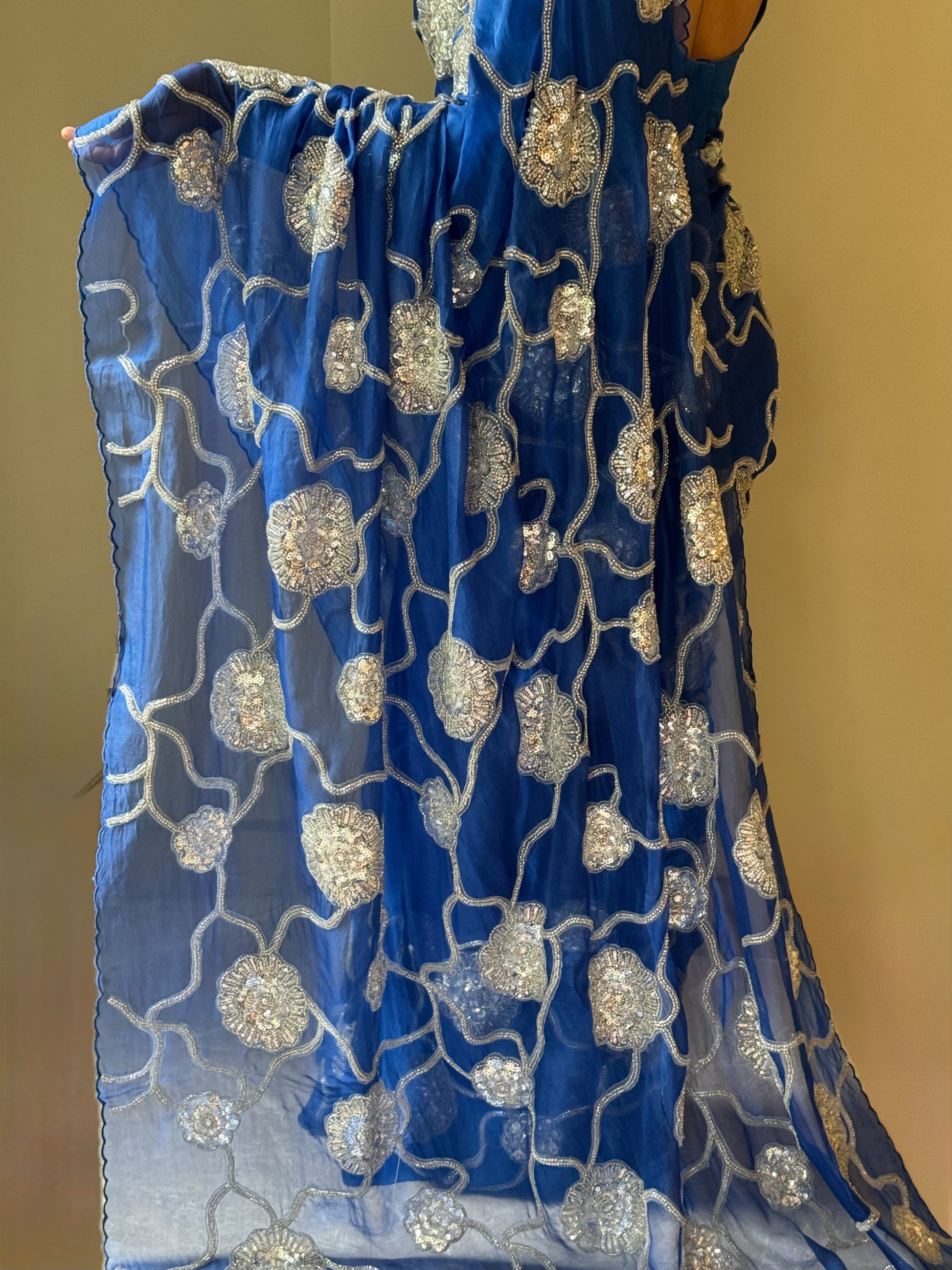 Description: A striking organza saree in royal blue, detailed with bold silver floral embroidery — opulent, structured, and made to impress. Part of the Rangtaari – Organza Elegance Collection, this saree stands out for its bold presence and intricate detailing. Crafted in premium sheer organza, the fabric holds its shape beautifully, giving the drape a crisp, elegant structure.