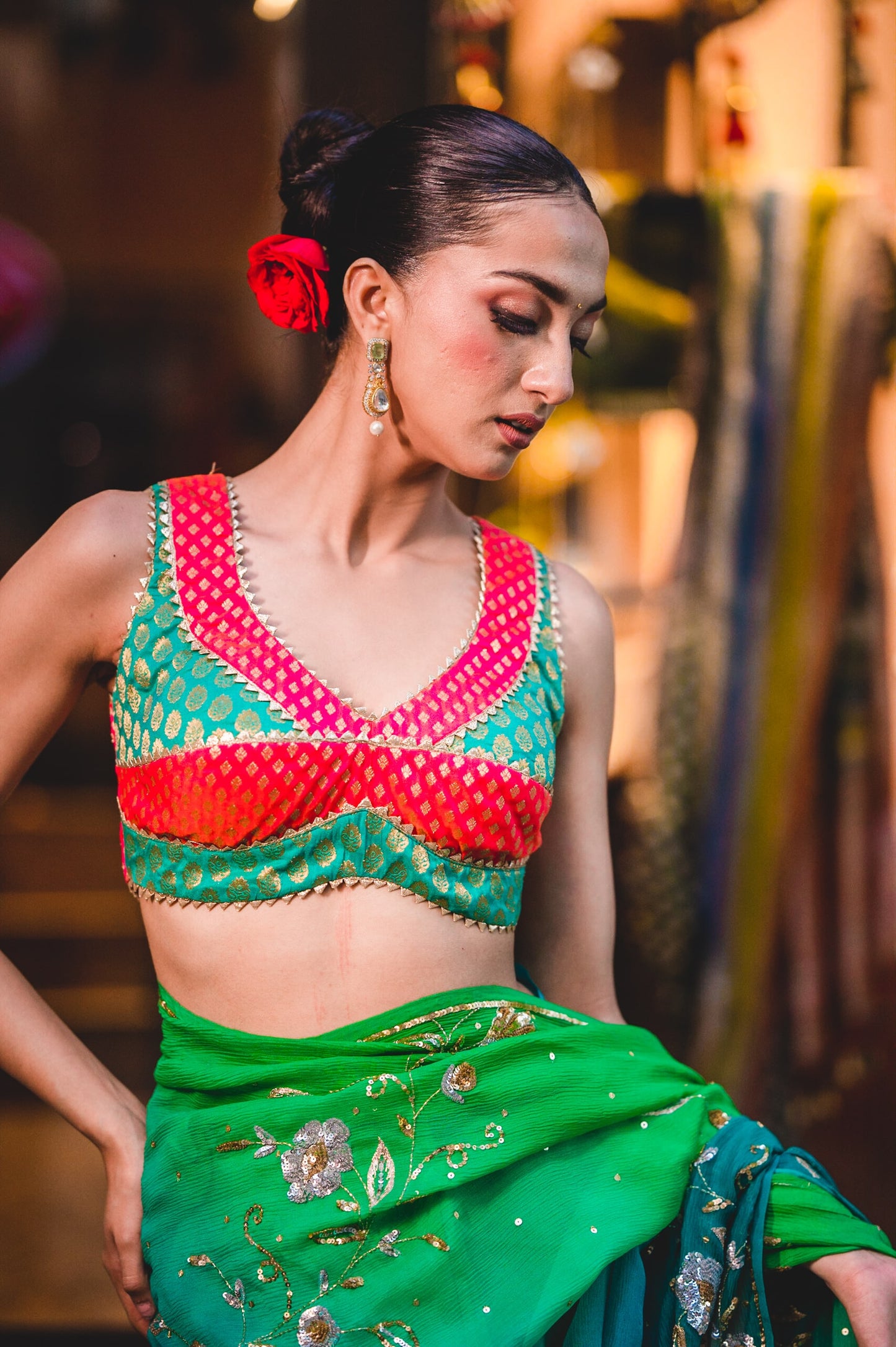 The prepossessing pink Gajri blouse with a traditional fabric of brocade has been weaved out with silver zari on fabric floral i shape. in the shade of pink and green combination brocade and gotta patti lace on it