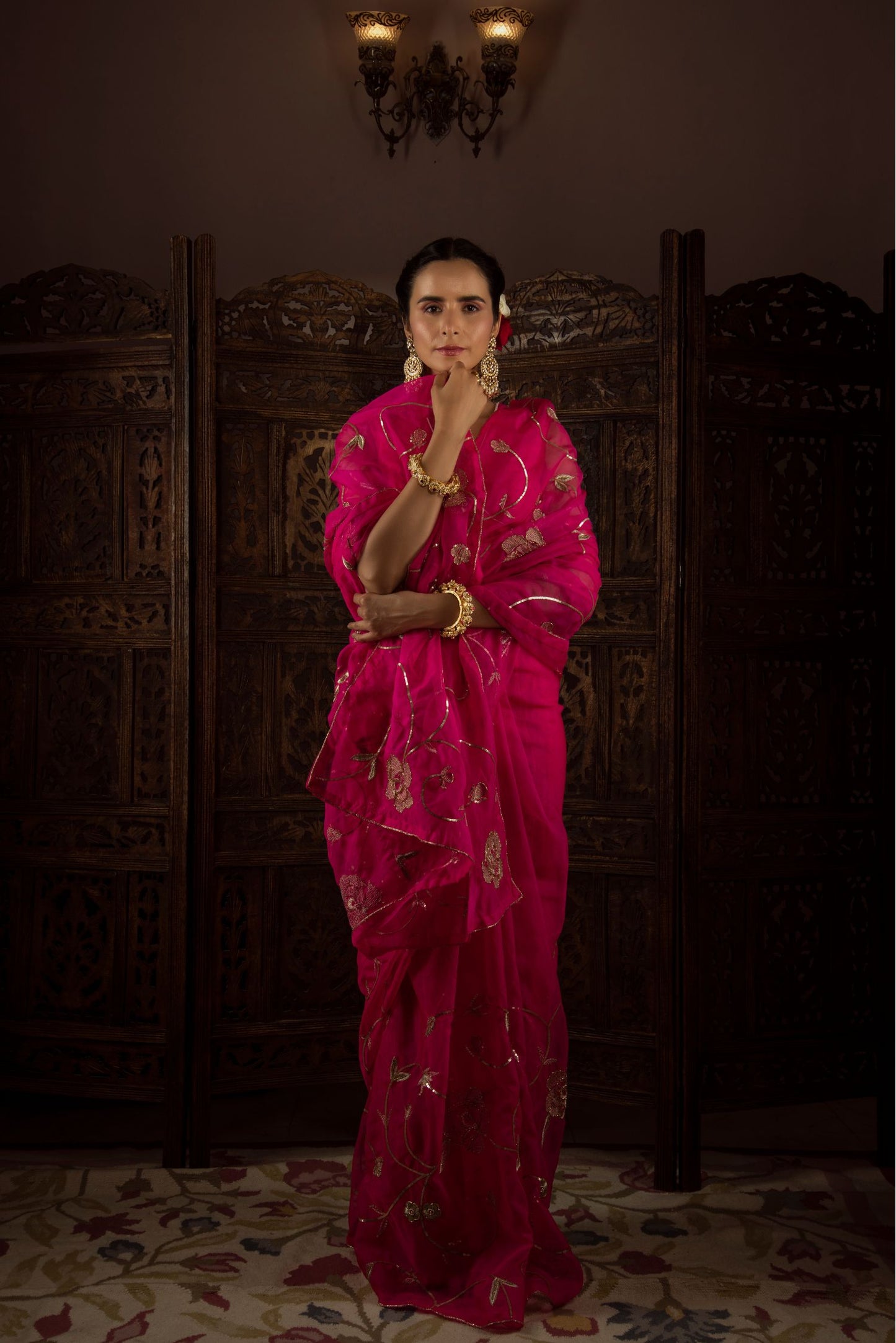 Description: The pink organza saree has been embroidered in perfect combination of gold zari thread and kat dana. It has beautiful floral jal all around the saree in floral boota. The boota has been crafted out with saree dabka and the steams are embroidered out of intricate sequence and saree material.