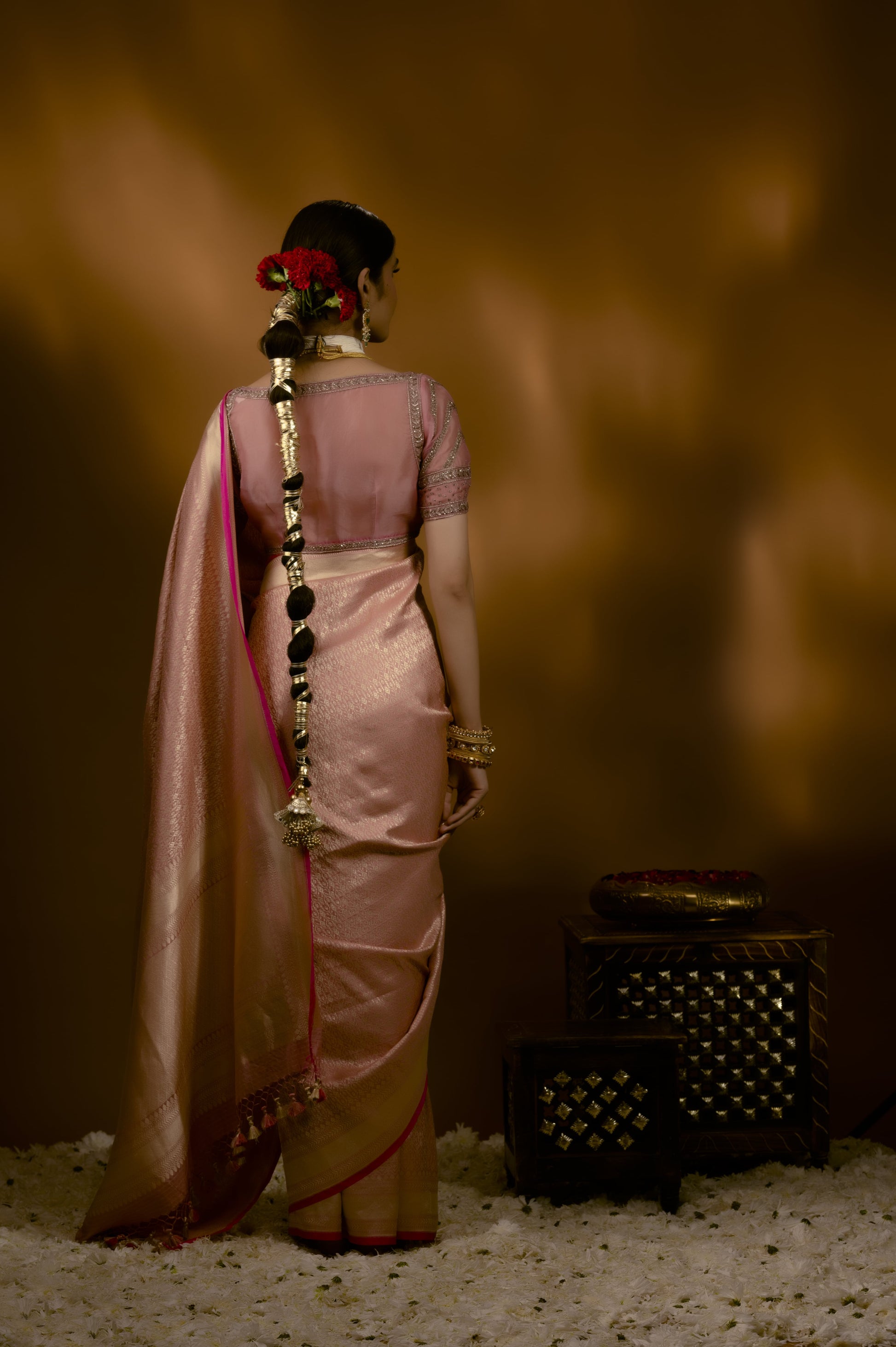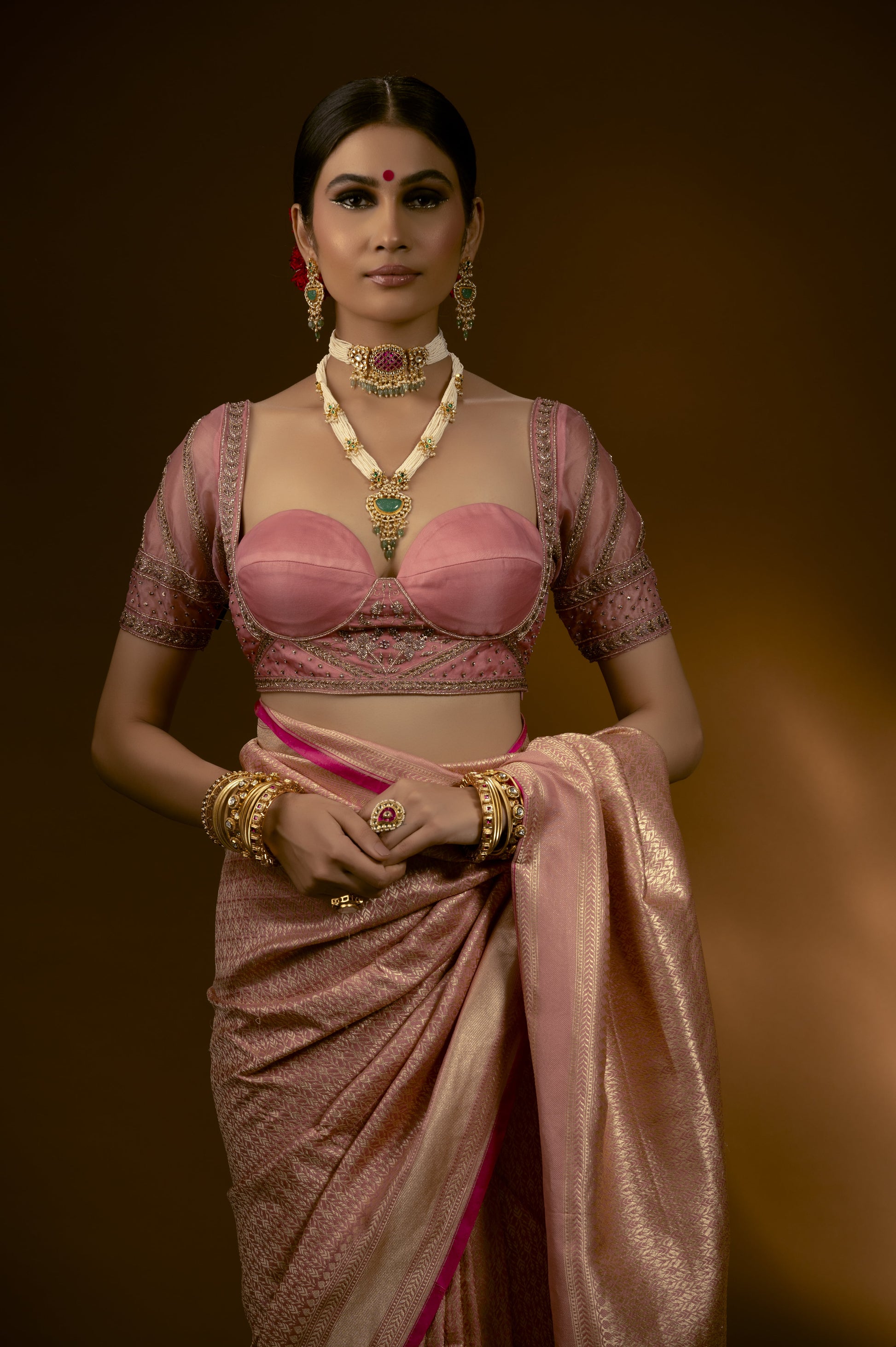 Description:This pink color blouse is rarest of rare to find. Having a fine kat dana and pearl hand embroidery, this blouse features a side zip. Match it with your favorite saree and this blouse will not disappoint you.
