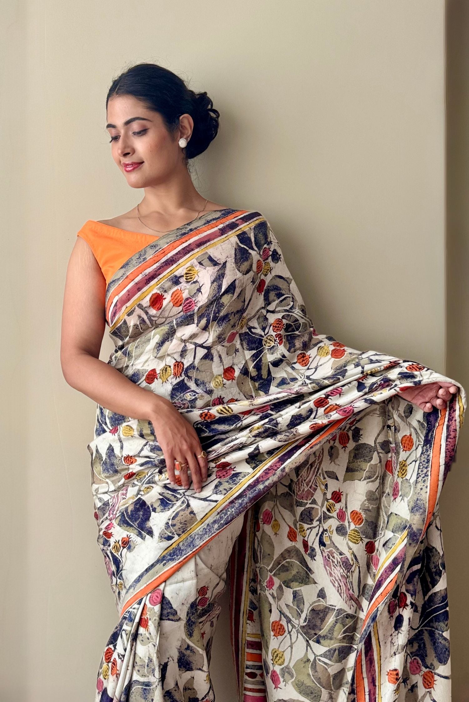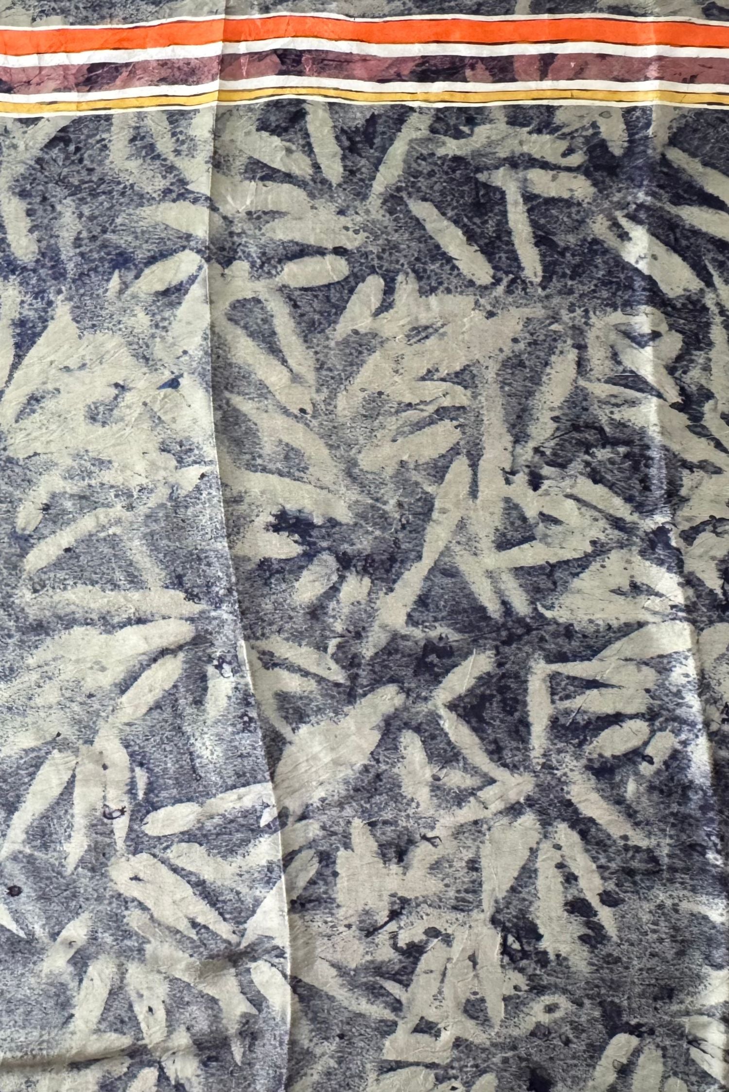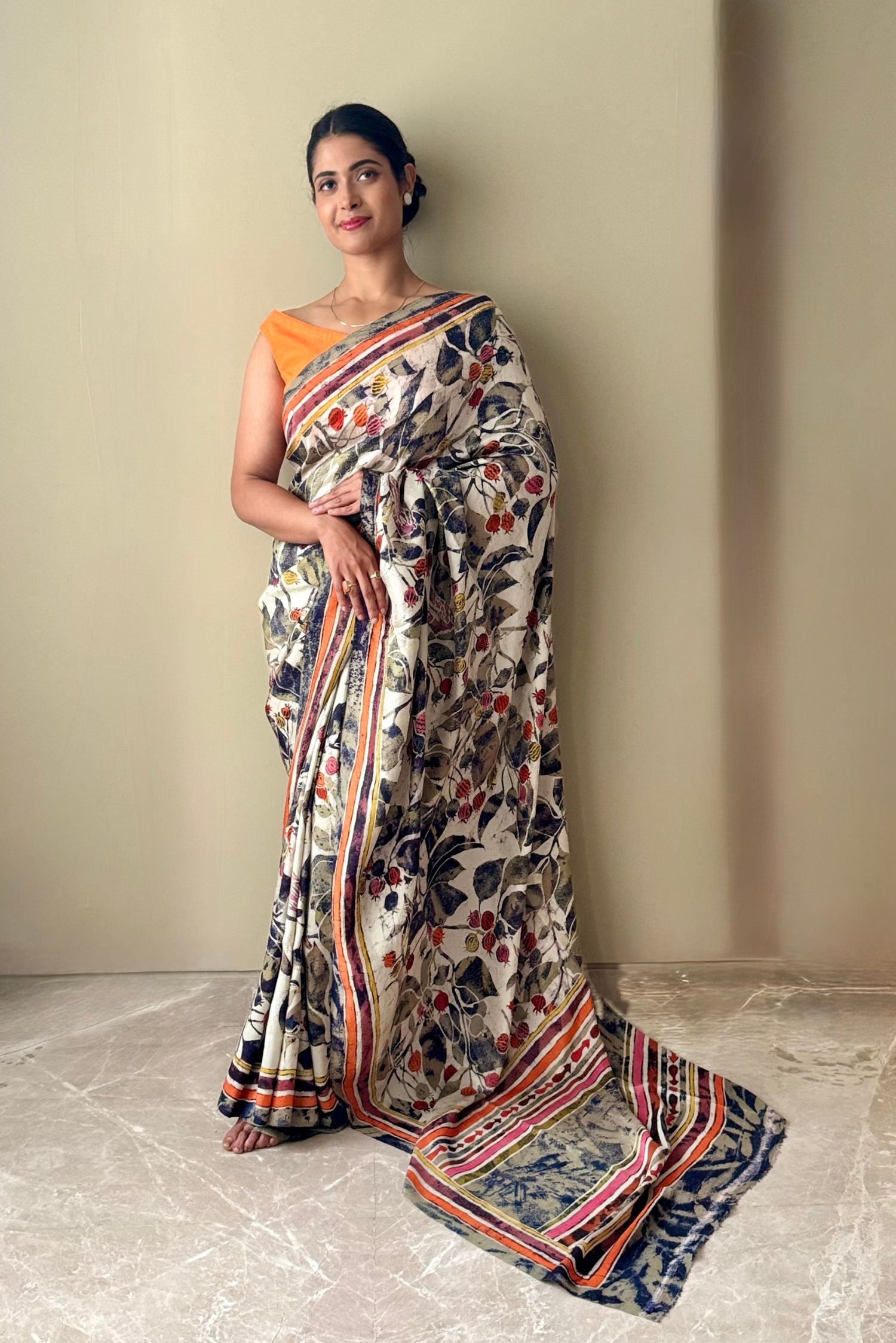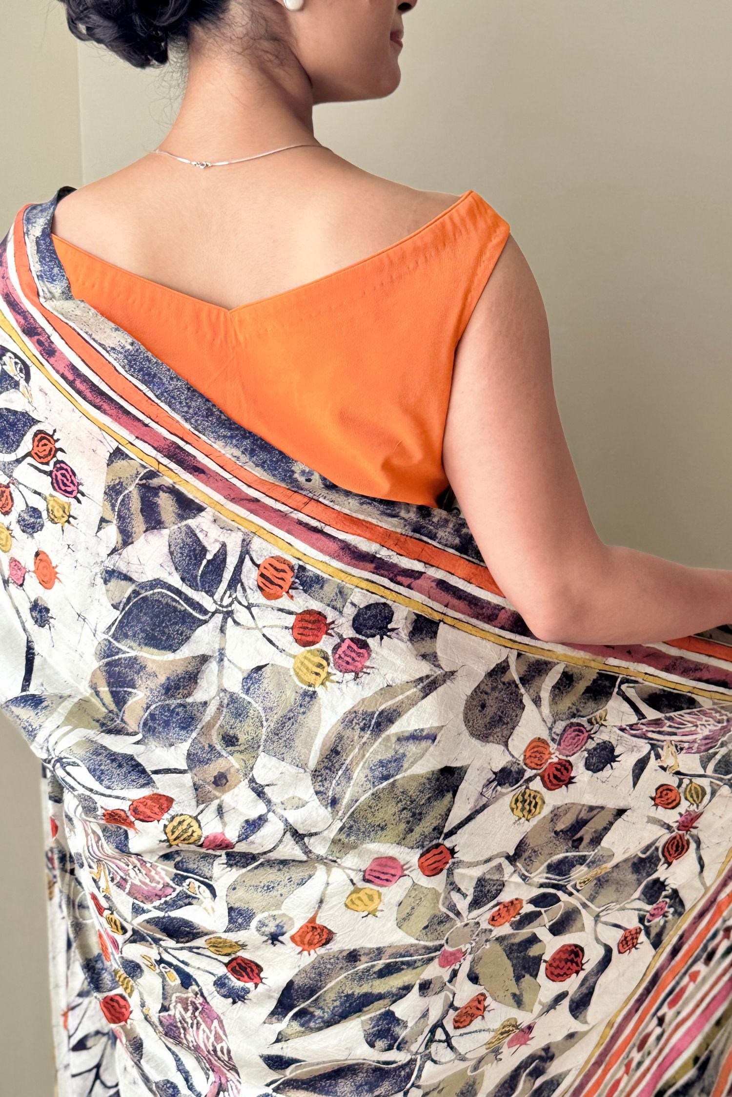 Description: From the Rangtaari Batik Silk Collection, this saree is a celebration of handcrafted artistry on pure silk. The base is a soft ivory, hand-painted with botanical motifs in indigo blue, leafy greens, and crimson florals. The patterns are complemented with a striking striped border in hues of orange, navy, mustard, and magenta, giving the drape a vibrant finish.