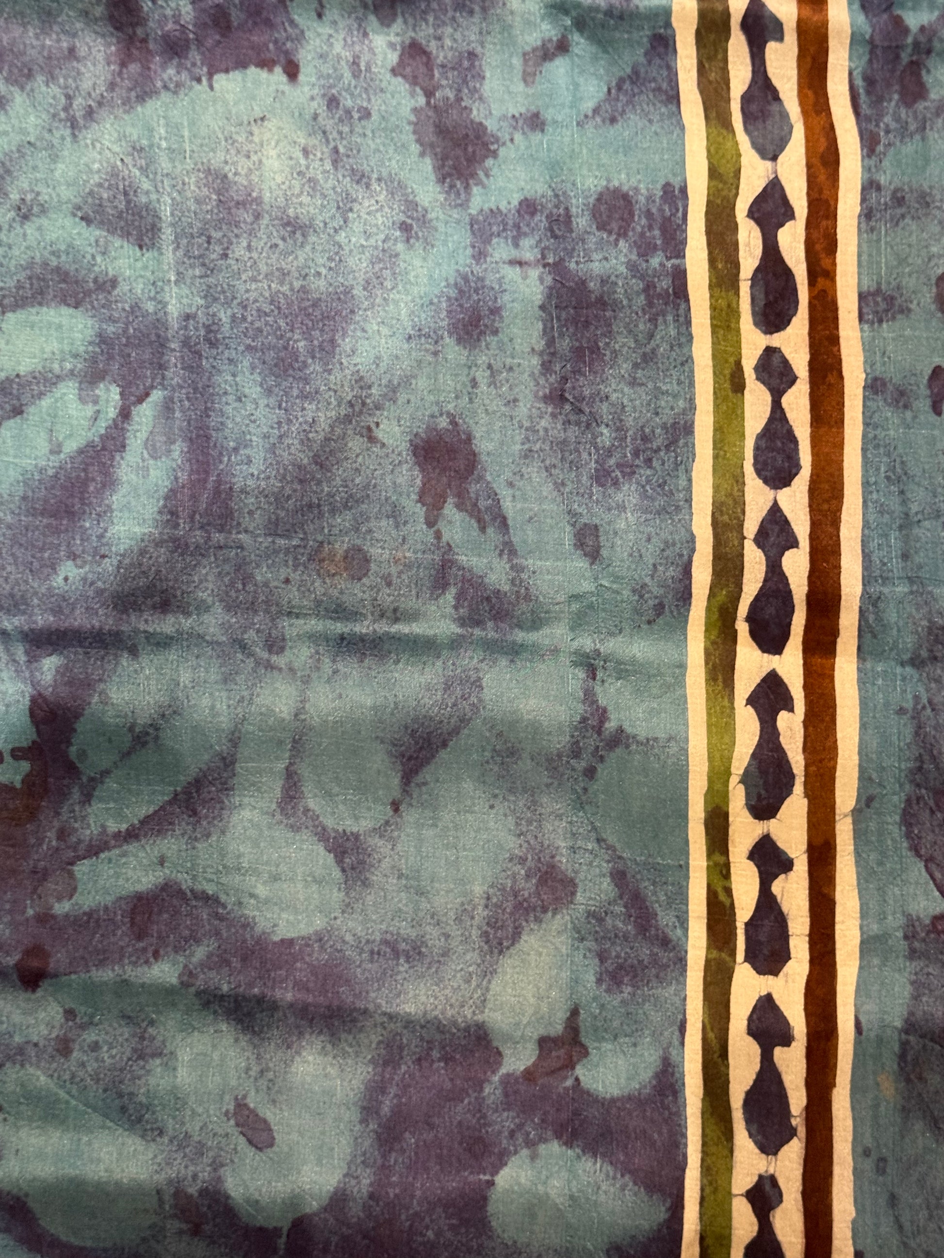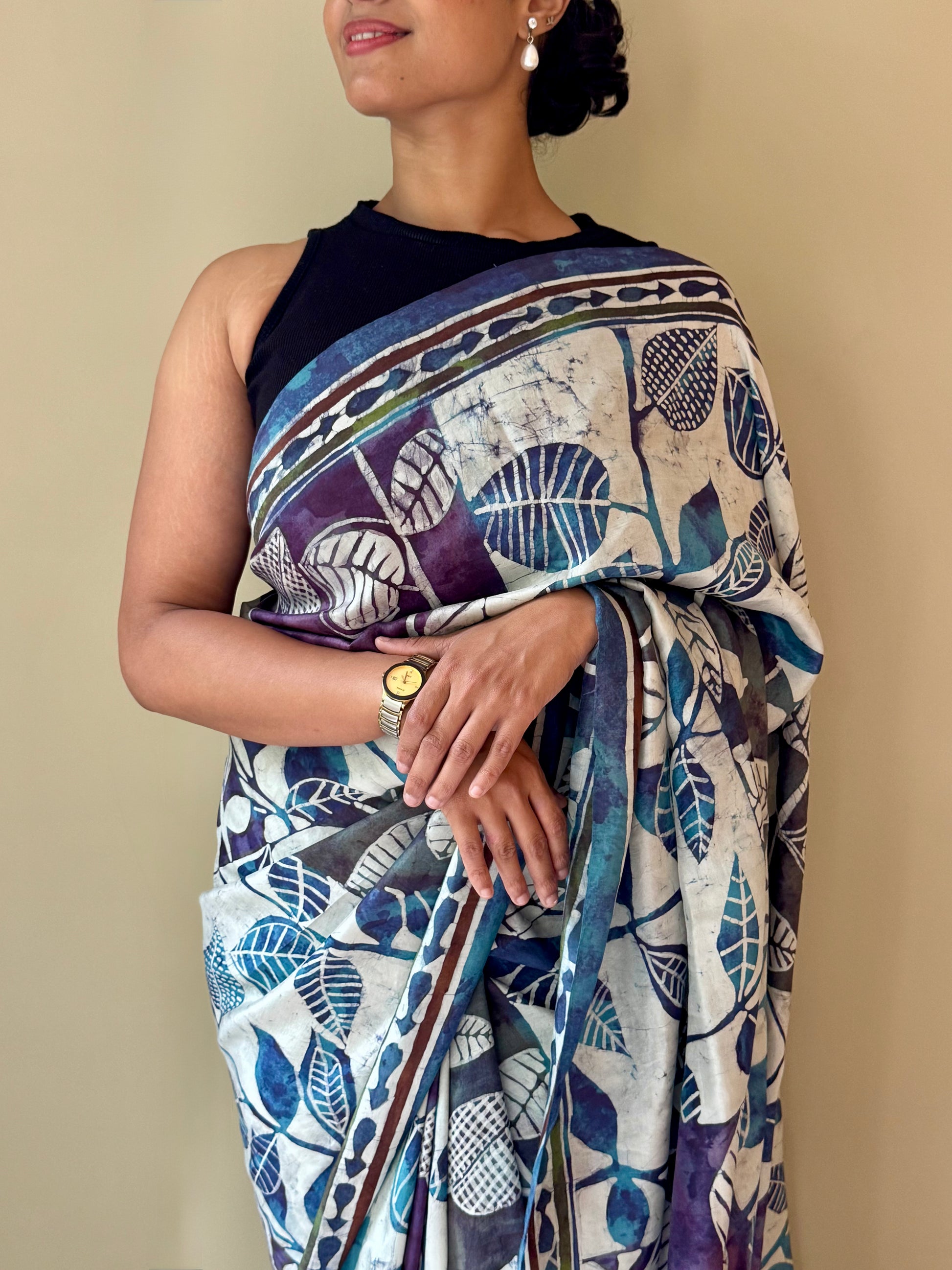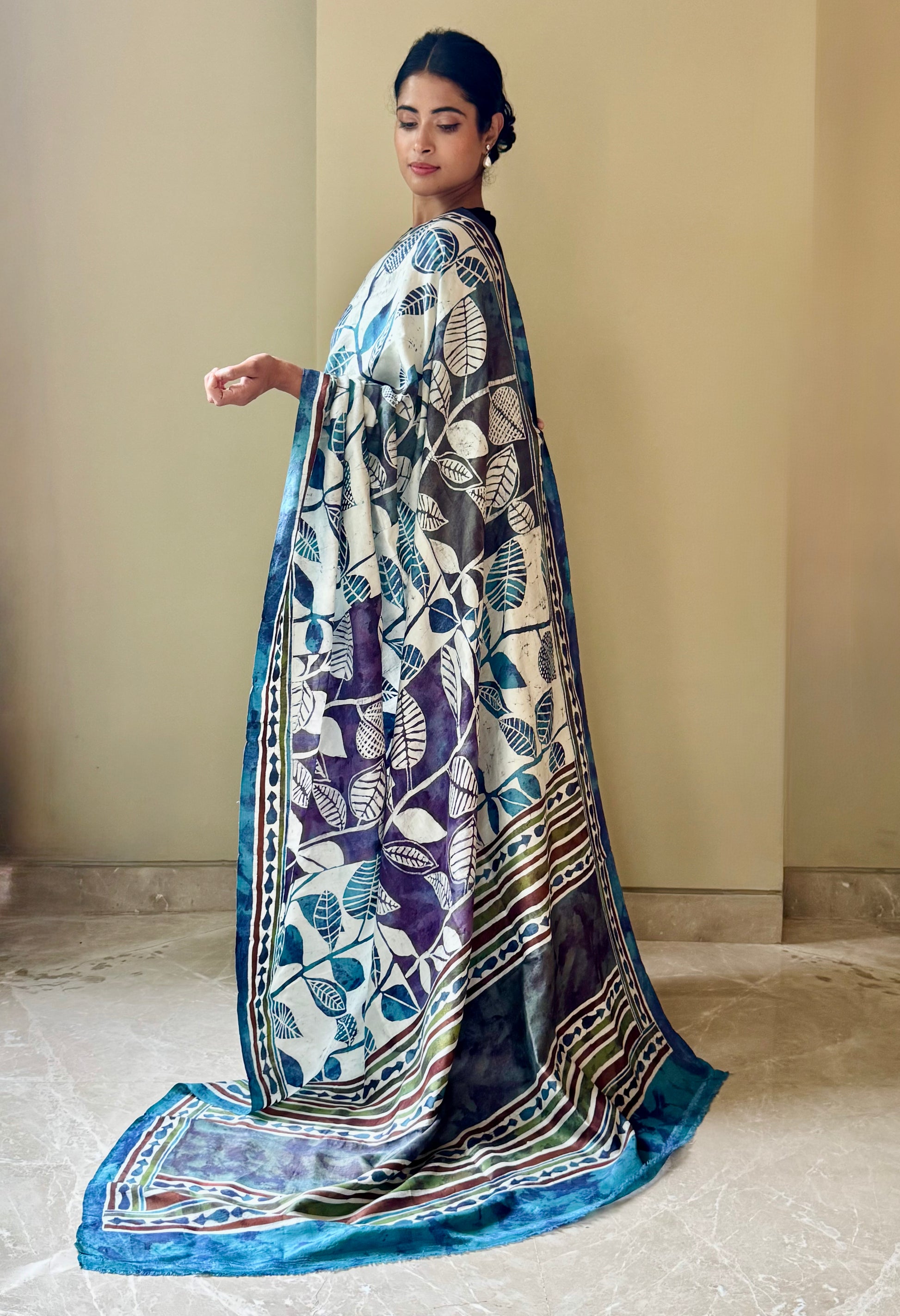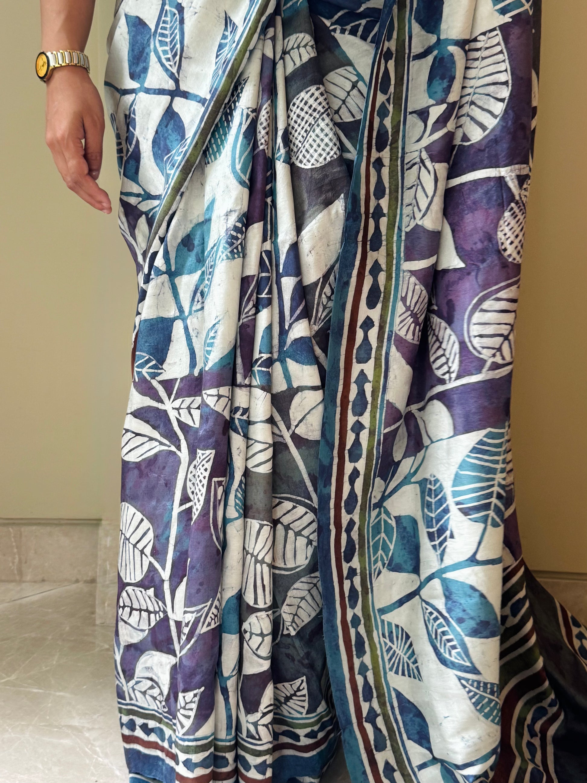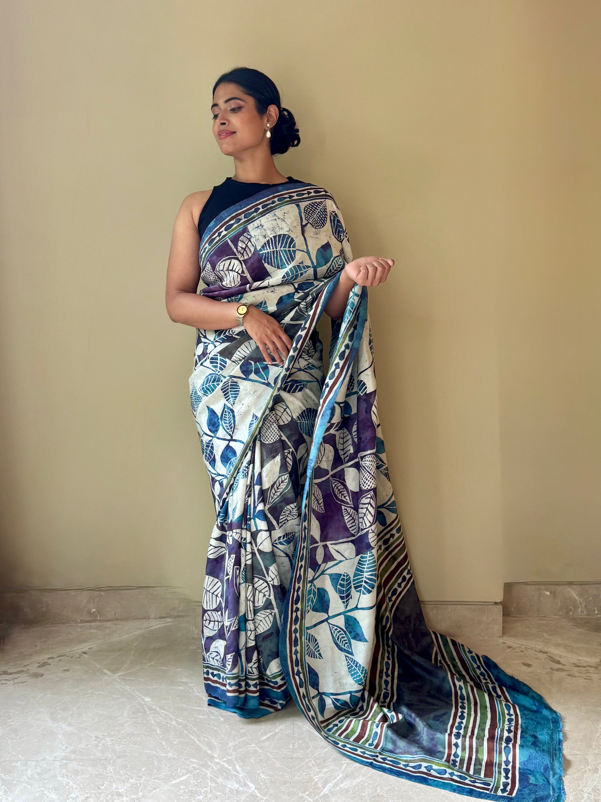 Colour: | The saree features large, layered leaf motifs in tones of blue, teal, ivory, and deep plum, creating a striking yet grounded visual story. The natural elements are balanced with clean lines and a geometric printed border |